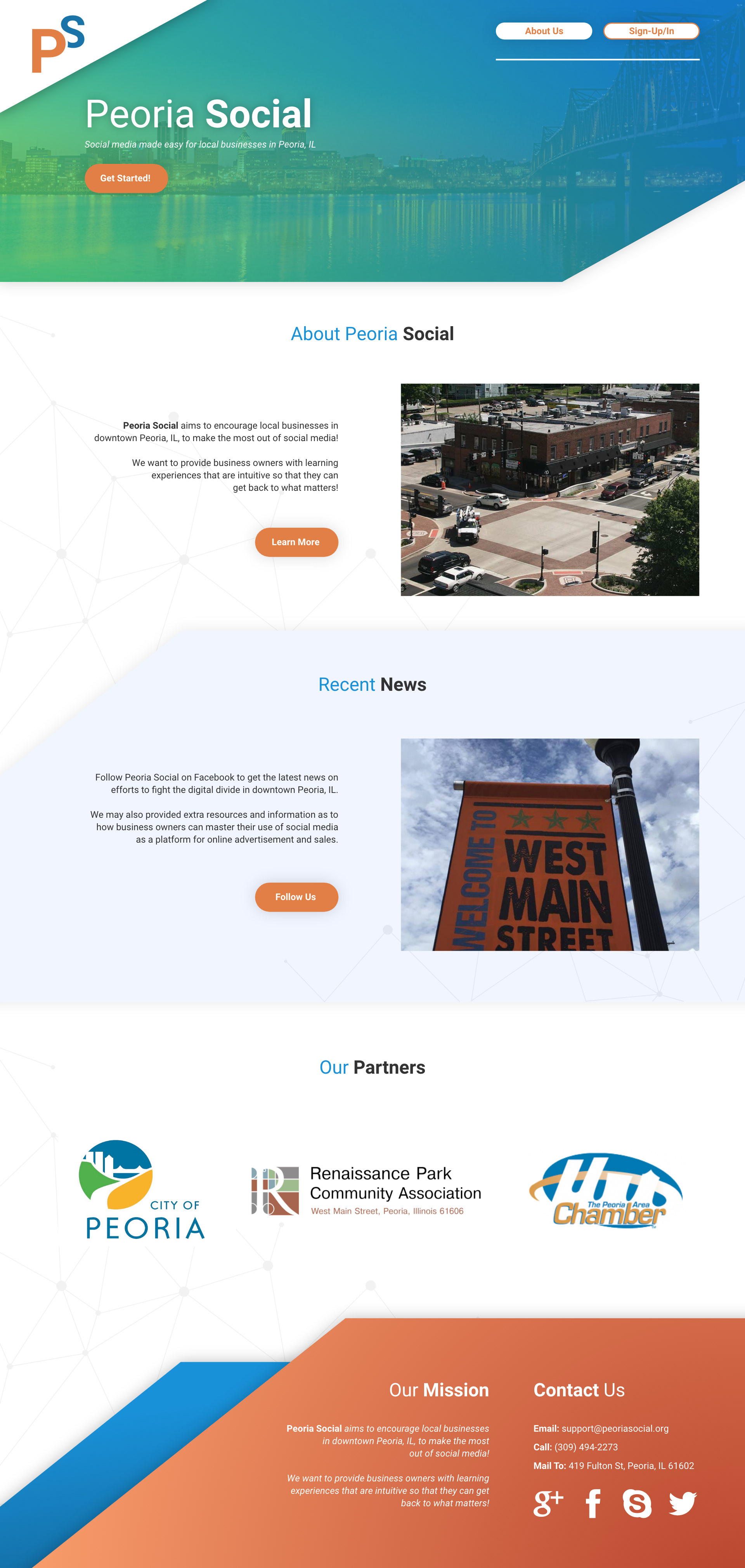 This particular project involved us splitting into groups and concepting/prototyping an app/online service for aiding local businesses on Peoria's historic West Main Street in competing with online businesses. My groups response was an online service named Peoria Social which was aimed at teaching, guiding, and encouraging business owners to better leverage social media platforms to improve their business. Done in 2018 at Bradley University.